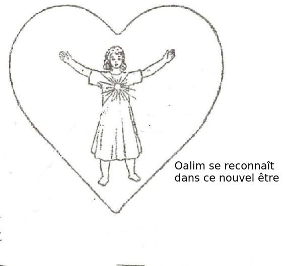 Quelques instants plus tard, le nouvel être humain sorti du cœur du germe étendit ses bras pour me faire prisonnier. Mais j'en fus effrayé, et cette peur me rejeta dans mon ancienne demeure. Le cœur de chair qui avait disparu remonta des profondeurs et entoura aussitôt les deux cœurs qui se trouvaient à l'intérieur; alors, le monde extérieur redevint visible à mes yeux, et tout ce qui était à l'intérieur s'évanouit.
